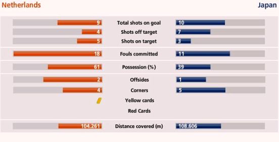 荷兰队全场比赛有9脚射门,5次射中门框范围内,其中包括一个进球和两次被日本队门将川岛永嗣化解的必进球机会。日本队有10脚射门,3脚射中门框范围,其中最后阶段的一次射门险些将比分追平。日本队的角球同样多于荷兰队,5次角球,比荷兰队多了一个。