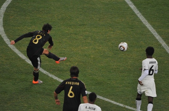 德国队的控球时间高于对手,但是前锋的把握机会能力差强人意。16分钟,波多尔斯基抽射打空。加纳队的控球能力也很强,队员们技术比较出色,反击十分犀利。第25分钟,德国队获得了开场以来最好的机会,厄齐尔拿球后单刀直入,但是面对对方门将金森,竟然将球射到对方身上,皮球被挡出。加纳队随后也发动进攻,阿尤角球开到前点,吉安高高跃起头球攻门,门将扑救不及,但幸好门前的拉姆护门成功,在球门线上用身体将球挡出。