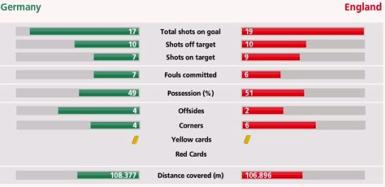 角球方面,德国队有4个,少于英格兰队的6个,其中英格兰队利用第一次角球的机会敲开了德国队的大门。