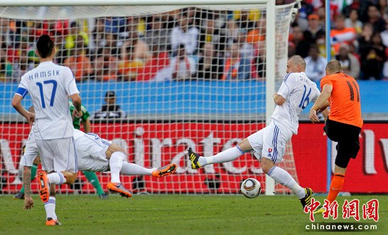 中新网6月28日电 今晚22:00,南非世界杯1/8决赛第五场比赛在德班球场拉开战幕,由E组头名荷兰队迎战F2第二名斯洛伐克。凭借罗本和斯内德在上下半场的进球,荷兰队以2-1淘汰斯洛伐克。补时阶段,维泰克为斯洛伐克队攻入一粒安慰性的点球。