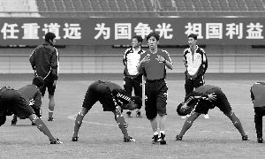 昨日上海骤然降温,淅淅沥沥的小雨悄然而至,国家队下午5时出现在训练场上,金山体育中心为国足打出“任重道远、为国争光、祖国利益高于一切”的横幅。主帅高洪波身穿红衣短袖,而助理教练傅博、区楚良则身穿白底的运动外套,在国家队队员的包围中,甚至很难辨别出少帅之身份。国安队及山东队的6名队员由于航班原因迟到,因此首堂训练课由25名队员参与。由于国足队员上周末刚打完职业联赛,因此首堂训练课主要以恢复性训练为主。训练内容从慢跑开始,队员们并没有成群结队一同跑,而是三三两两地分开慢跑,郑智、王新欣与周海滨分成一组,慢跑中队员不时聊天谈笑,气氛显得十分轻松,丝毫不觉联赛过后的疲惫。随后在傅博的带领下,队员分成三组进行抢圈训练,高洪波则在一旁当“监工”。在训练尾声,以高洪波领衔的教练组与国足一同慢跑,此次慢跑持续了超过20分钟。一个半小时的训练结束后,山东鲁能的4名队员韩鹏、王永珀、吴昊及刘金东才姗姗来迟,此时助教傅博气喘嘘嘘地喊队医尹煜华说:“拿着表,盯着他们跑20分钟啊。”尹大夫只好在雨中“独训”国脚。