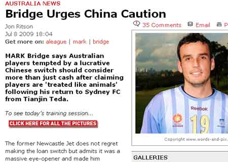 中新网7月9日电 布里奇,一个天津泰达队球迷都不会陌生的名字。这位澳大利亚外援曾在本赛季初效力于天津泰达队,现在已经离开中超加盟悉尼FC队。日前他在接受澳大利亚《442》杂志采访时愤怒的回忆了在中超的悲惨生活。他表示,中超的球员就像畜生一样被对待。