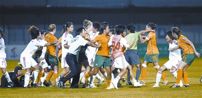 1:2落后,澳大利亚姑娘们似乎眼睛都红了!凶猛得近乎男足的飞铲在最后的时刻频频上演,无论是中国队还是澳大利亚队都在咬着牙坚持着。伤停补时的到来使得这场较量进入白热化,门将张越的一次受伤倒地成为导火索,澳大利亚队认为中国队是在故意拖延时间,两队顿起纠纷,双方替补席上的非比赛人员均冲入场内,一阵混乱过后,一名中国队教练和澳大利亚队后卫都被出示黄牌,如此激烈的判罚引起了澳大利亚球员的普遍不满……