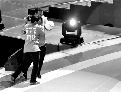 主持人邀请徐云龙上台,龙队刚走到台阶下,球迷家庭中的一个女球迷忍不住冲下台一把抱住他,全场笑成一片。主持人也笑弯了腰:“徐云龙,遇到过这么热情的球迷吗?怕吗?”龙队笑着回应:“不怕不怕,我已婚了!”