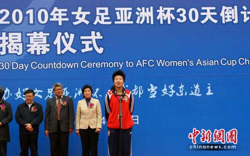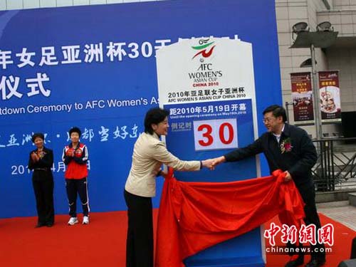中新网成都4月20日电(记者 杨杰)20日下午,2010年女足亚洲杯30天倒计时揭幕仪式在成都举行,中国足协副主席薛立、成都市副市长傅勇林、中国女子足球队教练陈金刚、中国女子足球队队长毕妍,以及泰国驻成都总理事孙建功等出席了揭幕仪式。