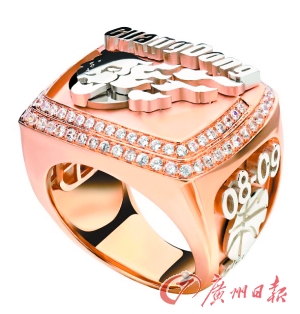 据钻戒设计人员透露,为使设计更加新颖,在材质的挑选上采用了正逐渐成为全球珠宝市场主流的18K玫瑰金,每枚重达40克,顶部镌刻着广东队的队标,环绕以79粒晶莹的高品质钻石;戒指的右侧面镌刻着“08-09”的字样和CBA篮球面孔的标志,左侧是球员姓名及球衣号码;指环下方用镭射技术刻有“戴梦得”的字样。整个戒指通体造型浑厚稳重,溢彩流光,充分表现出冠军球队的王者之气。戒指上的信息全部采用工艺复杂的分件倒模技术,呈现凸字效果,增加戒指立体感及时尚感。