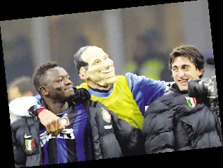 能在9人应战、裁判判罚也不大利于自己的情况下取胜,国米球员们赛后当然也显得兴奋异常,队长萨内蒂向球迷致敬,不少蓝黑球员围抱在一起跳舞唱歌,更为搞笑的是,国米替补铁卫马特拉齐,再度发扬自己惹是生非、挑衅对手的风格,居然戴上了一副不知道从哪里搞来的AC米兰主席贝卢斯科尼的面具,来嘲讽这位丑闻不断的意大利总理。尽管不能上场,但大马善于嘲弄与恶搞对手的顽劣本性,依旧是没有改变。而AC米兰球迷与球员,在看到自己的球队主席与老板,惨遭对手恶搞,只能是恨得牙痒痒,又无可奈何。