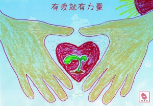 上周日,队医克兰顿打电话告诉姚明伤情时,后者正在忙着作画。缺席季后赛的消息并没有影响到姚明的画作。在这幅题为“有爱就有力量”的蜡笔画中,两只大手呵护着一颗红色的爱心,里面有新芽生出。