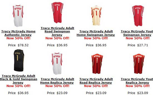 我们不得不注意一个事实:麦克·詹姆斯的球衣,在交易前两天以半价出售;“棒子”威尔斯和阿尔斯通的球衣在交易同一天被半价出售……打开火箭官方商店的网站,我们可以清楚的看到,麦迪系列的球衣已经被摆上了大甩卖货架,一律五折出售。