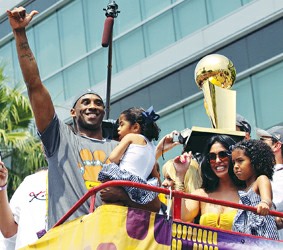 北京时间今晨,湖人第15次冠军游行,在洛杉矶市中心盛大举行,从斯台普斯中心到大体育馆,一路上,球迷身着紫金战袍,脸上画着油彩,高举双臂,祝贺湖人凯旋。