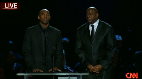 在追思会进行到中断的时候,约翰逊和科比身着黑西装缓缓步入讲台。科比在发表感言时说,“我们每个人都应该铭记迈克尔·杰克逊的贡献,他活在我们的记忆中.在台上和台下的他一样精彩,他永远与我们同在。”