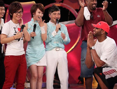 这不,在他结束中国行之前,安徽卫视的一档综艺节目邀请麦迪和前超级女声亚军周笔畅一同参加节目,让现场的观众大呼过瘾。在节目现场,当得知眼前这个较小的女孩竟然是中国的一位颇具实力的歌唱新星时,麦迪想尽一切办法希望能听到周笔畅的歌声,包括表演了各种篮球技巧。当然,为了回馈麦迪,周笔畅当场献上一曲《I Believe I Can Fly》。对于美国球员来说,这首歌是再熟悉不过的了,因为它几乎是为篮球飞人迈克尔·乔丹量身定制的。麦迪十分欣赏周笔畅的歌声,而且一边听还一边不停挥舞双手,连连称赞道:“她有一副好嗓子,我祝福她今后可以发展得更好!” 之后,与麦迪同行的友人更是抱起周笔畅的腰将她托起来灌篮。这一举动让周笔畅大感意外,对着歌迷说:“这可是我人生第一个大灌篮!” 。
