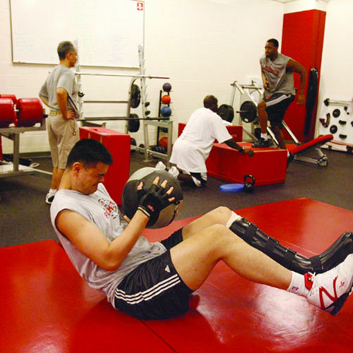 昨天,NBA官方网站公布了一些姚明与麦蒂在力量房训练的图片。麦蒂目前恢复情况不错,预计最晚在12月能重返球场,而姚明虽然不能参加对抗训练,但他在投篮和力量训练上花费了大量时间。