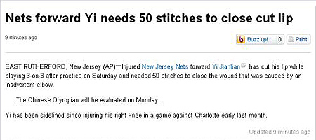 中新网12月7日电 北京时间昨日,据美联社报道,易建联在新泽西当地时间周六早上的一场三对三训练中被队友用手肘打破了上嘴唇。因为伤势严重,竟被缝了50针。