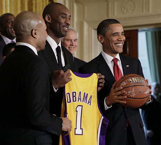 北京时间1月26日,NBA总冠军洛杉矶湖人队借着来到华盛顿与奇才比赛的机会参观了白宫。美国总统奥巴马亲切会见了湖人全队,并接受了一件印有1号号码的湖人球衣馈赠,他随后与湖人队合影留念。据洛杉矶时报报道,现场气氛友好祥和,每个人的脸上都挂着微笑,奥巴马在演讲中表示他认为科比是自己见过最有求胜心的球员之一。