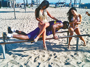 在本赛季NBA开始前,为了讨好洛杉矶挑剔的球迷,阿泰斯特曾自掏腰包与名模拍摄了一组写真。近日,阿泰斯特又力邀三位比基尼美女拍摄了一组写真——阿泰斯特在做俯卧撑时,一位美女坐在他身上,帮其进行负重练习。
