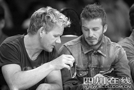 和小贝一起看球的,是英国顶级厨神戈登·拉姆塞,因其在各种名人烹饪节目中粗鲁、严苛,以及追求完美的风格,被媒体称为“地狱厨师”。贝克汉姆与拉姆塞的关系匪浅,正是小贝帮助拉姆塞进入了洛杉矶的名人圈子,并帮助他打响了在美国的招牌。当天,拉姆塞就坐在小贝包下的价值2200美元的座位上,也许是场上湖人的表现确实不佳,两人无聊之