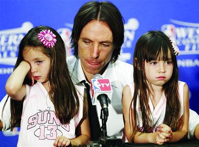 在赛后的发布会上,纳什两个可爱的女儿也出现在了现场,听到爸爸的一番辛酸言论,两个女儿当场落泪,而看到女儿落泪,纳什再也控制不住自己的情绪,流下了两行悲壮的英雄泪。(金鑫)