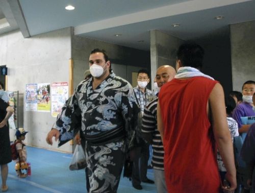 这次率队巡业的是日本相扑横纲的朝青龙。为了对孩子们负责,预定举行的力士与孩子们的“儿童训练”不得不中止下来。许多孩子为此遗憾连连,在现场向戴着口罩的大相扑不断地挥手致意。