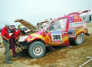 至本报昨天截稿时,中国车手除赵永国退赛外,只有金城摩托车队的苏文敏完成了第七赛段的艰苦比赛。而后续的情况是,汽车组威麟车队的老将卢宁军以10小时1分第32个完赛,成为当天汽车组中国车手中唯一没有被罚时的人。其余3位车手因为在组委会关门时间之后才返回,均被罚12小时。在不计被罚时间的情况下,长城车队的周勇成绩是15小时08分45秒,列赛段第44。老卢的队友江耀桓用了16小时38分11秒,赛段成绩第57。兴业银行酷车时代的朱金忠用时16小时47分30秒,成绩列第58位。