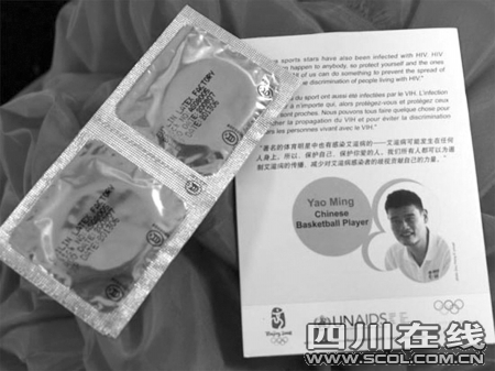 “奥运收藏第一人”赵晓凯在南京展示了这款特殊的奥运村避孕套,和普通款不同,这款避孕套不仅有英法文的介绍,还有舞动北京中国印的标志,更加独特的是,外包装上还有抗艾大使姚明的头像(图)。据悉,北京奥运期间,国际奥委会在奥运村放置了10万避孕套预防艾滋病,姚明作为防艾滋病形象大使,他的肖像被印到了少量的“精装版奥运村避孕套”上,在奥运后,这款避孕套成为奥运藏家热追的藏品。“奥运收藏第一人”赵晓凯介绍,这是迄今为止他找到的第一款。赵晓凯表示,姚明版避孕套的拍卖所得,将用于救助只有14个月大的南京白血病患儿。(徐杨)