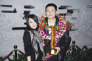 昨日下午,第14届LG世界棋王赛冠军孔杰从韩国首尔返回北京,孔杰的妈妈与体育总局棋牌中心主任刘思明、北京棋院副院长谭炎午等领导早早来到机场迎接。女友陈小匀也来到机场,与载誉归来的男友小秀了一把恩爱。