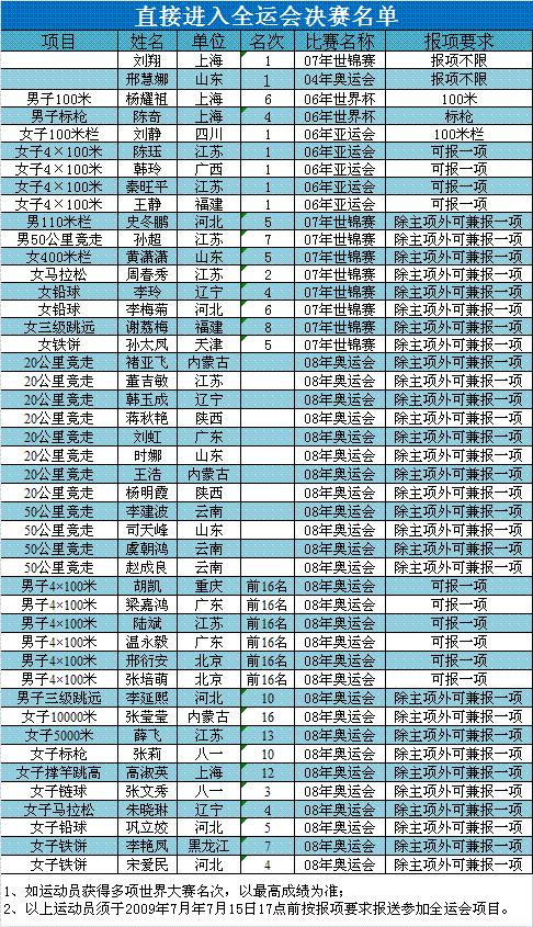 其中参加重大比赛(奥运会、世锦赛、世界杯赛、亚运会、黄金联赛、其它洲际赛事等)的运动员,没有获得名次积分的,其成绩按全国锦标赛的名次积分。取得名次的将按评分表规定积分。代表中国队参加邻国邀请赛、访问赛、对抗赛的运动员成绩和名次按国内大奖赛的标准积分。(保罗)