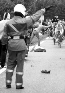 据法国媒体报道,事故发生在距离第14赛段起点科尔马38公里处的维特尔斯海姆。当时,跟随在领骑集团身后的警方摩托车正在为第二集团的车手开路,乡间公路上突然冒出一名61岁的老妇,来不及避让的摩托车与之正面相撞,老妇当即死亡。随后,失控的摩托车又撞上了两名正在路边观战的车迷,导致一名37岁的妇女背部受伤,和一名61岁的老翁腿部骨折。据悉,事故发生时,这名37岁的妇女手中还怀抱着一名1岁大的婴儿,好在婴儿没有受伤。
