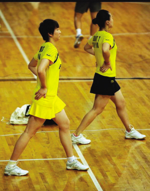 网球场上女选手穿着短裙打球已经蔚然成风,羽毛球场上的美少女们还处于“遮遮掩掩”的状态,穿裙子比赛的远远少于穿裤装的。不过也有勇于“尝试”的,昨日中国队里的女双组合张亚雯和赵婷婷、成淑和赵芸蕾都穿上了裙装——张亚雯、赵婷婷穿的是黑衣红裙,成淑、赵芸蕾则是黄色裙子。不知是否是穿着裙装更利落,两对组合都轻松挺进女双八强。