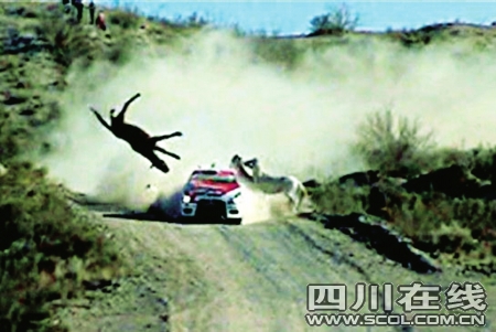 阿根廷赛车手费·比亚格拉正在阿根廷南部参加汽车拉力赛。赛车行驶到内格罗河省的罗卡将军城附近时,遇到三匹马正在穿越公路。比亚格拉只看到其中两匹,等发现第三匹马时已经来不及躲避了,赛车和马猛烈相撞后将马撞得凌空而起。这起事故造成这辆三菱赛车的前半部分损伤不轻,但是比亚格拉仅仅因为事故耽误了30秒钟,随后驾驶着赛车继续前进,并且完成了当天的全程比赛。(新华社)