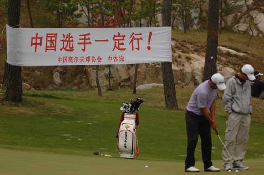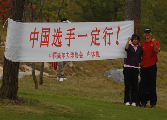 中新网首尔9月25日电 (张哉麟) 2009“韩国KEB银行”中韩职业高尔夫球巡回赛韩国站比赛今日在韩国OSTAR高尔夫球俱乐部继续进行,球场边有横幅上面用中文写着“中国选手一定行!”,有工作人员还在这横幅面前,与中国选手合影留念。