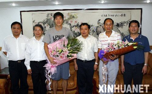 上海莘庄训练基地,上海市普陀区委书记周国雄等人当日代表普陀父老乡亲为即将出征全运会的刘翔壮行——刘翔是“土生土长”的普陀人。灰色T恤,灰色短裤,踏一双亮黄色的运动鞋,刚睡过午觉的刘翔看起来气色不错。