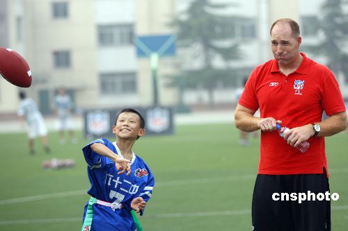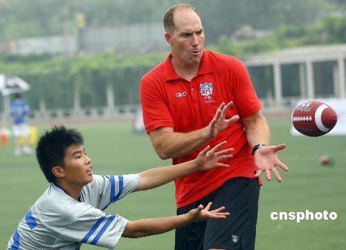 八月八日,来自美国橄榄球联盟(NFL)费城鹰队近端锋查德·路易斯,在北京朝阳区垂杨柳中学橄榄球训练营内培训指导中国橄榄球小队员,这些小队员包括中国二零零六赛季冠军球队、即将参加在德国腰旗橄榄球世界杯的广州培正中学队员、北京小队员以及苹果种子学员。中新社发 盛佳鹏 摄
