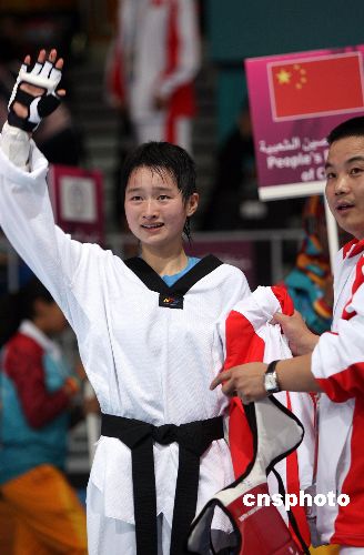 率先进行的女子四十九公斤级比赛,中国队派出世锦赛冠军王莹、大运会和世青赛冠军吴静钰分守上、下半区,两人不负众望,一路过关斩将会师决赛。此前两人分属两个级别,从未在正式比赛中交手。十九岁的吴静钰比队友矮了一头,但身高不占优势的她却以一套简练、实用的“无影腿”技惊四座,凭借出色的腾空连击技术,她三次击中对手头部,以六比零的绝对优势干净利落地为中国队拿下第一枚金牌。