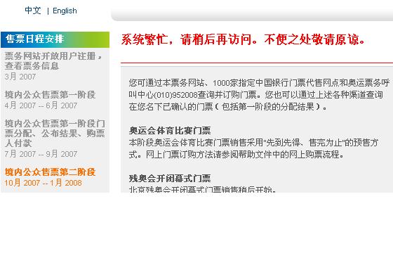 与第一阶段抽签决定门票获得者不同,此次发售实行“先到先得,售完为止”的销售政策。所以9点钟刚过,记者就尝试打订票热线,不过30分钟后,记者还是没有打通。记者随后尝试访问北京奥运会官方票务网站,该网站显示“系统繁忙,请稍后再访问。不便之处敬请原谅。”后来让其他朋友访问,则干脆访问不了页面。
