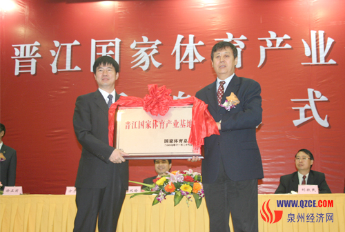 中新社晋江十二月十八日电 (记者 林永传)继荣获“世界茄克之都”、“中国鞋都”等十三个“国字号”区域品牌称号之后,中国“品牌之都”福建晋江再获殊荣。十八日上午,中国国家体育总局国家体育产业基地授牌仪式在此间举行,国家体育产业基地正式落户晋江。这是继深圳、成都之后,中国内地第三个获此殊荣的城市,也是唯一县级市。