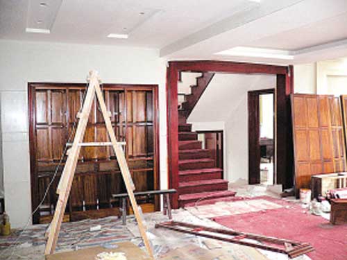 在丁俊晖的伯父丁龙君的带领下,记者参观了“江南春天”的内部装修。尽管屋子里仍堆放着一些尚未完成的家具,但整体装修已经初步完成。走进客厅,一张红木的大圆桌映入眼帘。“这桌子全红木的,光雕工就要3千多块,”丁龙君一边说一边指着放在边上尚未拼装起来的三个大床,“这几张床也是红木的,我们请的宜兴的师傅,雕工相当棒的,这件房子里,只要是木头就都是红木的,除了桌子椅子、床和衣橱,二楼和三楼的博古架,我们连厨房的橱柜也都用的红木,包括家里的楼梯、房门和门套。”丁龙君告诉记者,丁俊晖的父亲很喜欢红木的家具,所以在装修之前花了40多万买了红木的木料,家里的家居都是专门请师傅根据丁俊晖爸爸的要求打的,连工钱一起花了将近60万。