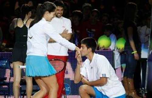 5岁的时候就认识,并且开始一起学习网球,德约科维奇和伊万诺维奇可谓是青梅竹马、两小无猜,感情自然不是一般的深厚。眼见着如今20岁的小伊日渐出落成了一个大美女,小德也颇有些耐不住寂寞,就在澳网前夕,在家乡贝尔格莱德的一场表演赛上,德约科维奇还当众上演了“求婚秀”——在伊万诺维奇面前单膝跪地,并且用哀求的眼光看着对方,最后还深情地吻了阿娜的手背,让小美女“吓”得不轻。
