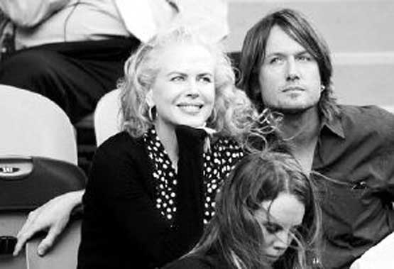 在昨天休伊特和德约科维奇的比赛中,休伊特的同胞妮可.基德曼和她的丈夫、乡村歌手凯西.厄本一同现身观众席。作为好莱坞著名的时尚人士,观看网球比赛的妮可也尽显时尚本色,黑底白点的连衣裙让这位金发女郎显得既高贵又大方。图为妮可和丈夫在观看比赛。