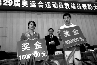 昨天,河北省政府表彰在北京奥运会上取得优异成绩的河北运动员及其教练。获得跳水3米板单人项目和女子3米板双人项目两枚金牌的运动员郭晶晶(左)及其教练李芳、获得射击男子10米气手枪金牌的运动员庞伟(右)及其教练员张胜阁被授予“河北省优秀体育工作者”荣誉称号,同时受到经济奖励。
