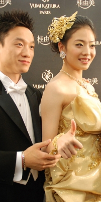 这件由桂由美打造的价值3000万元的黄金婚纱,是婚纱界的顶级艺术品。全世界仅有两件,另外一件已经被日本国立博物馆收藏。完成造型,穿上婚纱,当两人手挽手出现在大堂时,无数闪光灯顿时闪起。此时的杨威有些紧张,抿着嘴挤出一丝笑容,倒是杨云显得自然很多,一手拿着红色礼花,大方地向镜头露出迷人的微笑。过了10分钟,杨威才从紧张的情绪中舒缓过来,左手搭在杨云的肩上,两人一起摆着POSE。