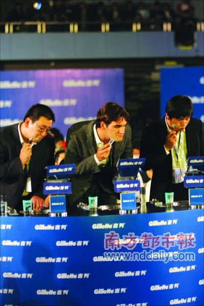 一通大山侃完,费德勒开始跟大学生代表近距离互动,这次他送出的礼物是自己当场签名的《费德勒自传》。最后的剃须环节则与去年完全一致,费德勒一手拿着麦克风一手拿着剃须刀“言传身教”,告诉学生们哪些是正确的剃须方式,哪些是不该养成的坏习惯。台下千余人集体效而法之,人人下巴上沾满白色洁面膏的场面猛一看去,倒也蔚为壮观。
