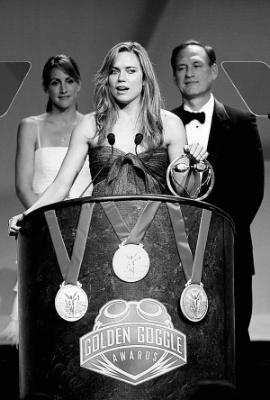 昨天,菲尔普斯和“女飞鱼”考芙林出席了美国“金泳镜”奖的颁奖典礼,两人分别将男子和女子的“金泳镜”荣誉搬回了家。