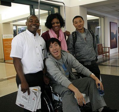 没了拐杖的刘翔自然不会一蹦一跳地出现,5分钟之后,一身灰色运动服的刘翔也出现在了医院门口。依然是那个搞怪的刘翔,只是身下的轮椅有些让他不习惯。就连“飞人”自己都觉得坐在轮椅上有点丢脸,一看到镜头就用手遮住脸,只露出一只眼睛来,冲着镜头直笑。