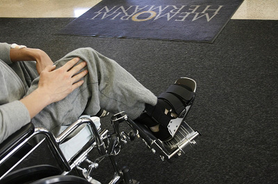 或许是在安静的医院待久了,好动的刘翔一出赫曼纪念医院就冲着所有人做起了鬼脸,那个熟悉的刘翔又回来了。不过刘翔的这次亮相有点不同:“飞人”暂时栖息在轮椅上,右脚还包裹着厚厚的纱布,外面再加上一个高至膝盖下方的护具。