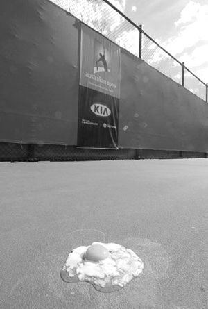 果然,昨天一大早,炙热的阳光便烤得人们头昏眼花,气温也很快蹿升到40摄氏度以上,使得整个墨尔本像一个大火炉。据报道,墨尔本郊外的铁轨在烈日暴晒下,部分已经变形,火车因此延误。有记者在赛场中央试着打了个鸡蛋,没想到鸡蛋竟被煎熟了。