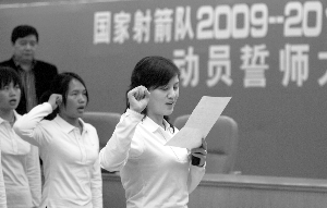 昨天下午,新一届中国射箭队在广州黄村基地进行了动员大会。在射运中心主任高志丹,副主任王义夫和总教练田渝陵的带领下,北京奥运射箭金牌得主张娟娟代表运动员宣读誓词,射箭队全队面对国旗誓师。