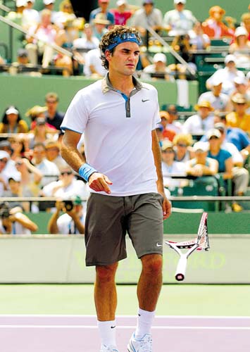 在今晨进行的迈阿密索爱公开赛男单半决赛中,费德勒摔拍了———在决胜盘第3局再次打丢一个机会球后,他将球拍往地上重重一砸、拍子立马报废。