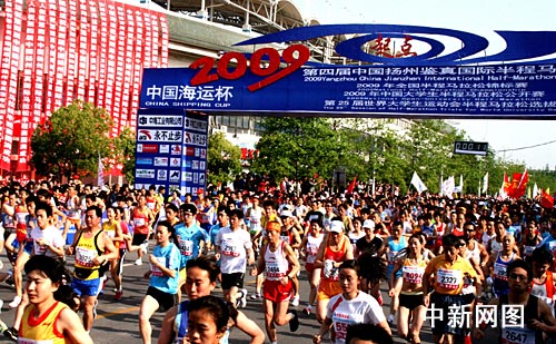 中新网扬州4月26日电(记者 崔佳明)4月26日上午,由中国田径协会、中国大学生体育协会、江苏省体育局、扬州市人民政府联合主办的第四届中国扬州鉴真国际半程马拉松赛、2009全国半程马拉松锦标赛、中国大学生半程马拉松公开赛和世界大学生运动会半程马拉松选拔赛在扬州体育场同时拉开战幕。