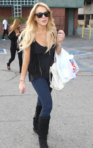 林赛·罗韩最近依然是厄运连连,每次出现都被媒体追逐,上法院接受审理也是一会笑一会哭一会打哈欠,但是这位街拍小女王每日的穿衣还是值得我们关注的,一件黑色的造型款马甲配上了超低胸的内搭,大大的性感随性,下身选择了紧身的LEGGING质地的裤子,白色的大手包,绝对的气场十足。